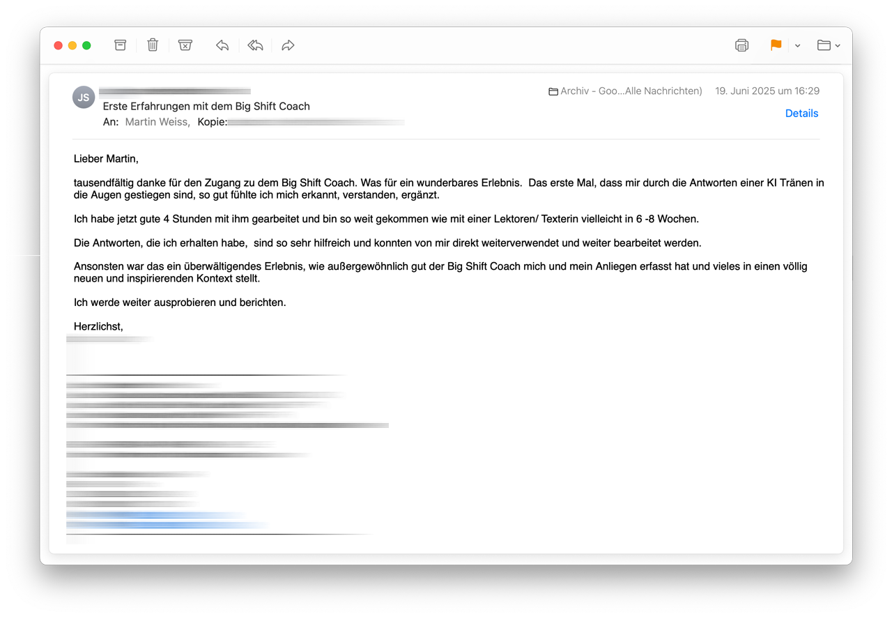 »Ich bin sowas von den Socken von deinem KI Coach. Also sowas habe ich ja noch nicht erlebt. Ich bin geflasht ohne Ende. Ich habe gerade noch mal eine Arbeit mit ihm gemacht.